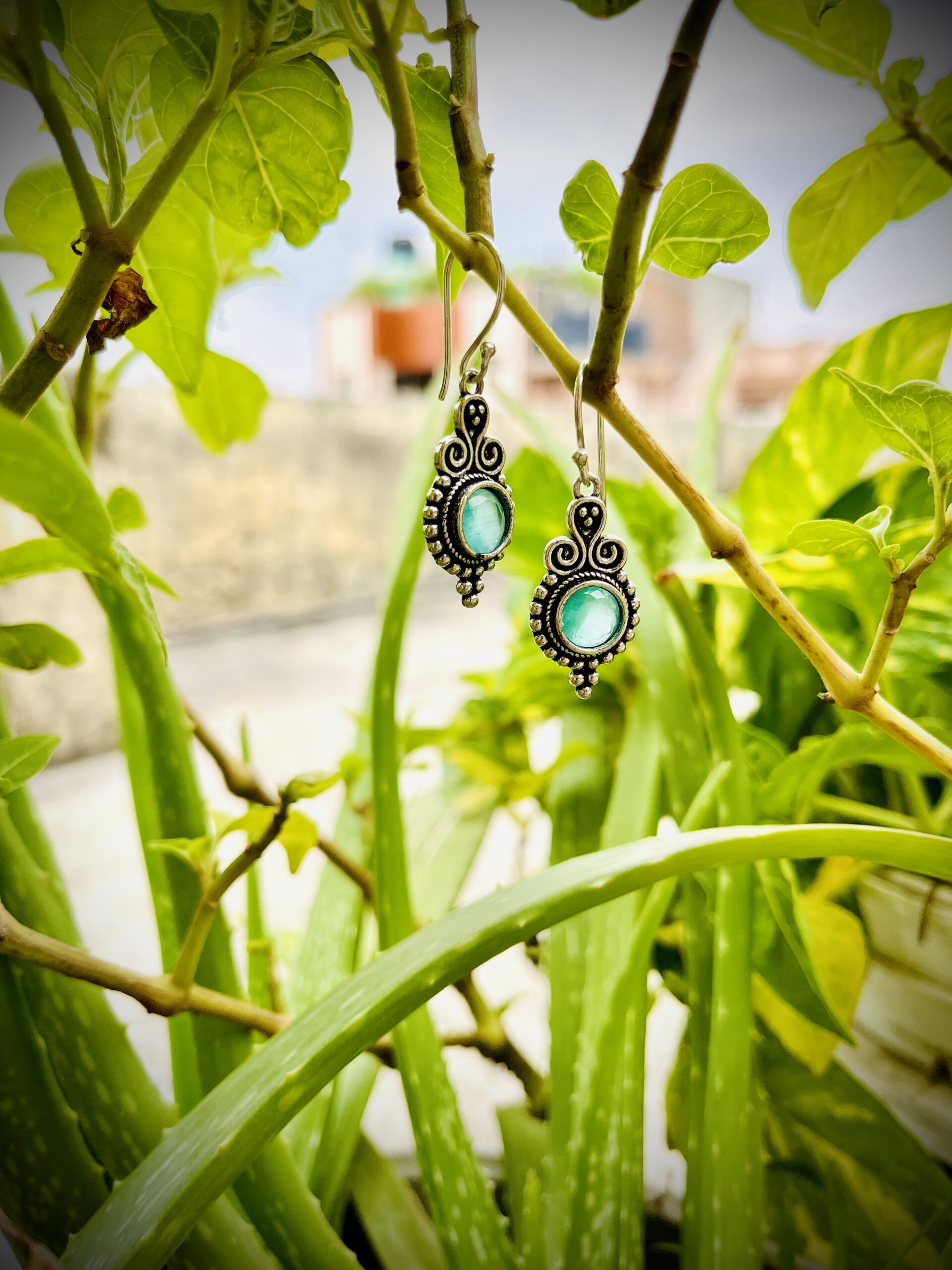 These are filigree teardrop earrings with a green stone center. The intricate metalwork surrounding the stone is characteristic of filigree jewelry. The earrings feature a teardrop shape and a green cabochon or a similar type of smooth, polished stone.